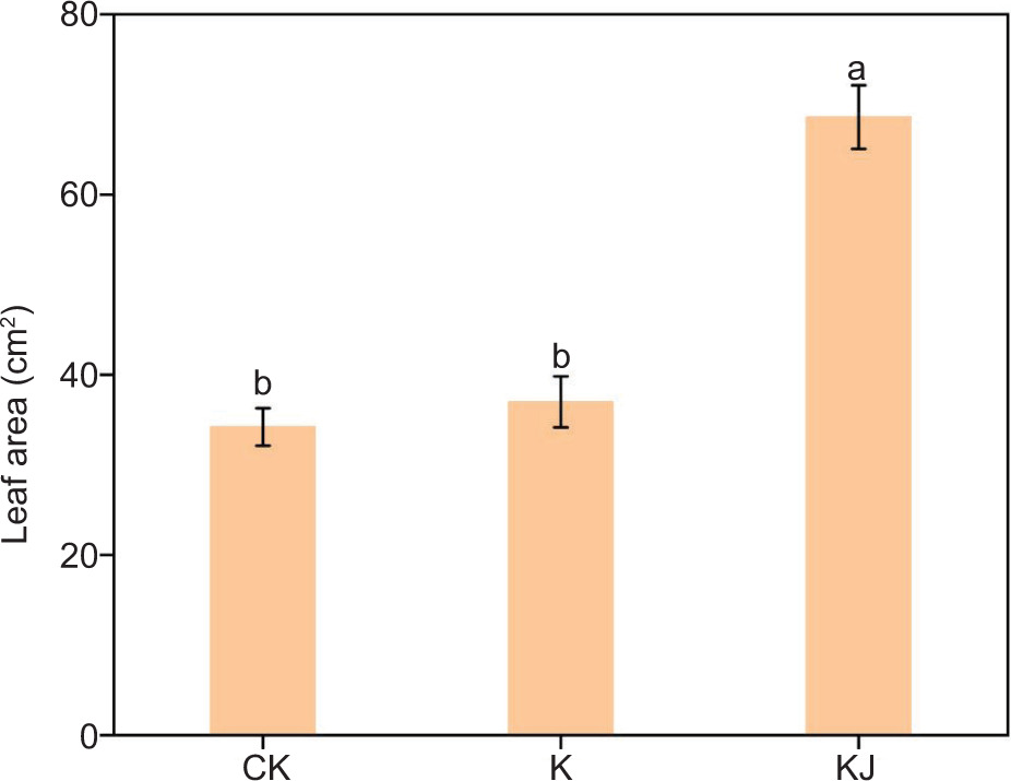 Figure 1. Leaf area of quinoa seedlings treated with different microbial agents. Different lowercase letters indicate significant differences between processing groups (P<0.05). CK is the control group, K is the application of Kaiduo explosive root microbial agent, KJ is the compound application of Kaiduo explosive root microbial agent and phosphate-solubilizing bacteria.