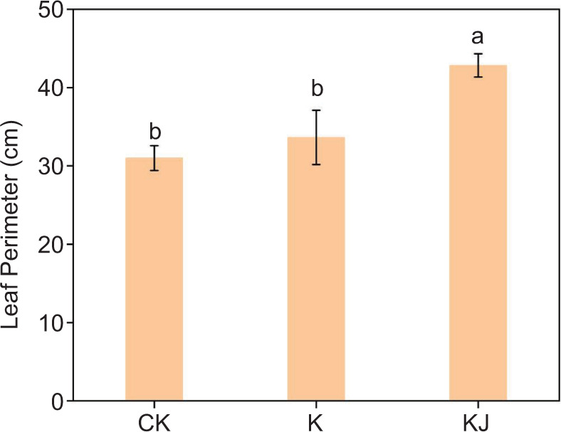 Figure 2. Leaf perimeter of quinoa seedlings treated with different microbial agents. Different lowercase letters indicate significant differences between processing groups (P<0.05). CK is the control group, K is the application of Kaiduo explosive root microbial agent, KJ is the compound application of Kaiduo explosive root microbial agent and phosphate-solubilizing bacteria.