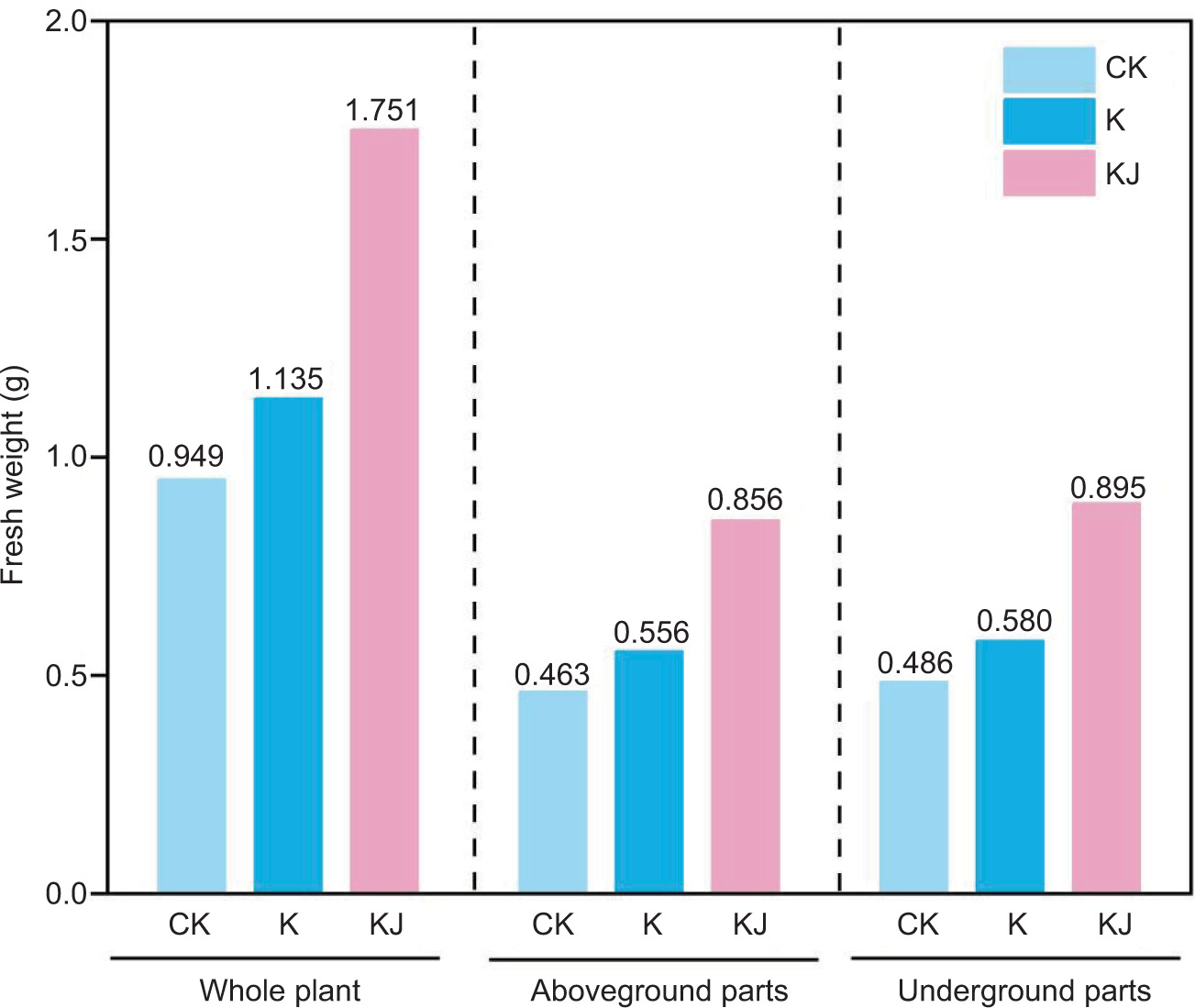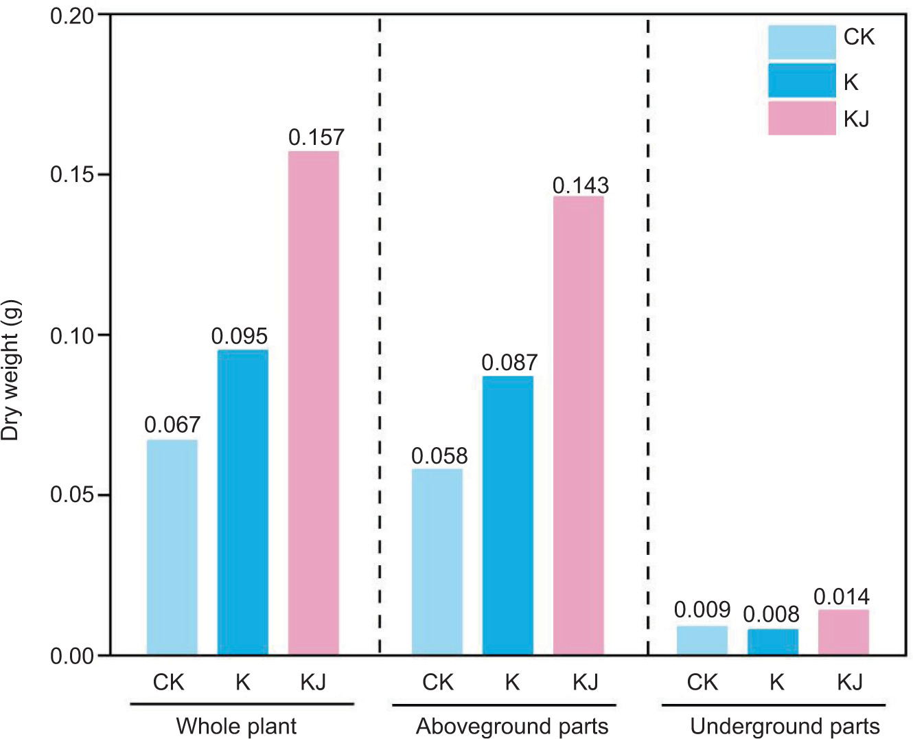 The biomass data of quinoa seedlings under different microbial agents are shown in Figures 3 and 4. The fresh weight and dry weight of the whole plant in the KJ group increased by 54.27% and 65.26% compared with that of the K group, and the fresh weight and dry weight of the whole plant in the K group increased by 19.60% and 41.79% compared with that of the CK group, respectively. The fresh weight and dry weight of the aboveground part in the KJ group increased by 53.96% and 64.37% compared with that of the K group, and the fresh weight and dry weight of the aboveground part in the K group increased by 20.09% and 50.00% compared with that of the CK group, respectively. The fresh weight and dry weight of the underground part in the KJ group increased by 54.31% and 75.00% compared with that of the K group, and the fresh weight and dry weight of the underground part in the K group did not differ much from that of the CK group. It proved that the effect of dephosphorylating microorganisms on the biomass of quinoa was basically the same as that of the root and leaf traits, and the combined application of AFM and dephosphorylating bacteria could increase the biomass of quinoa compared with the application of AFM alone.