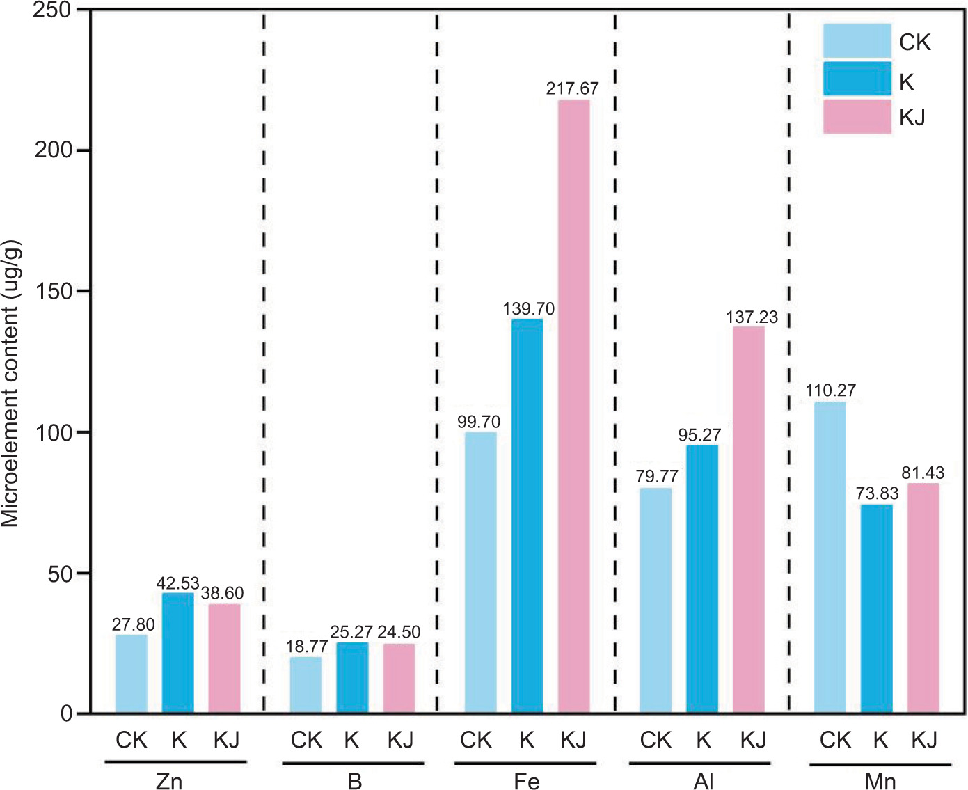 Figure 5. The microelements in quinoa seedlings of different treatment groups. The numbers in the figure represent the mean values for each treatment group. CK is the control group, K is the application of Kaiduo explosive root microbial agent, KJ is the compound application of Kaiduo explosive root microbial agent and phosphate-solubilizing bacteria.
