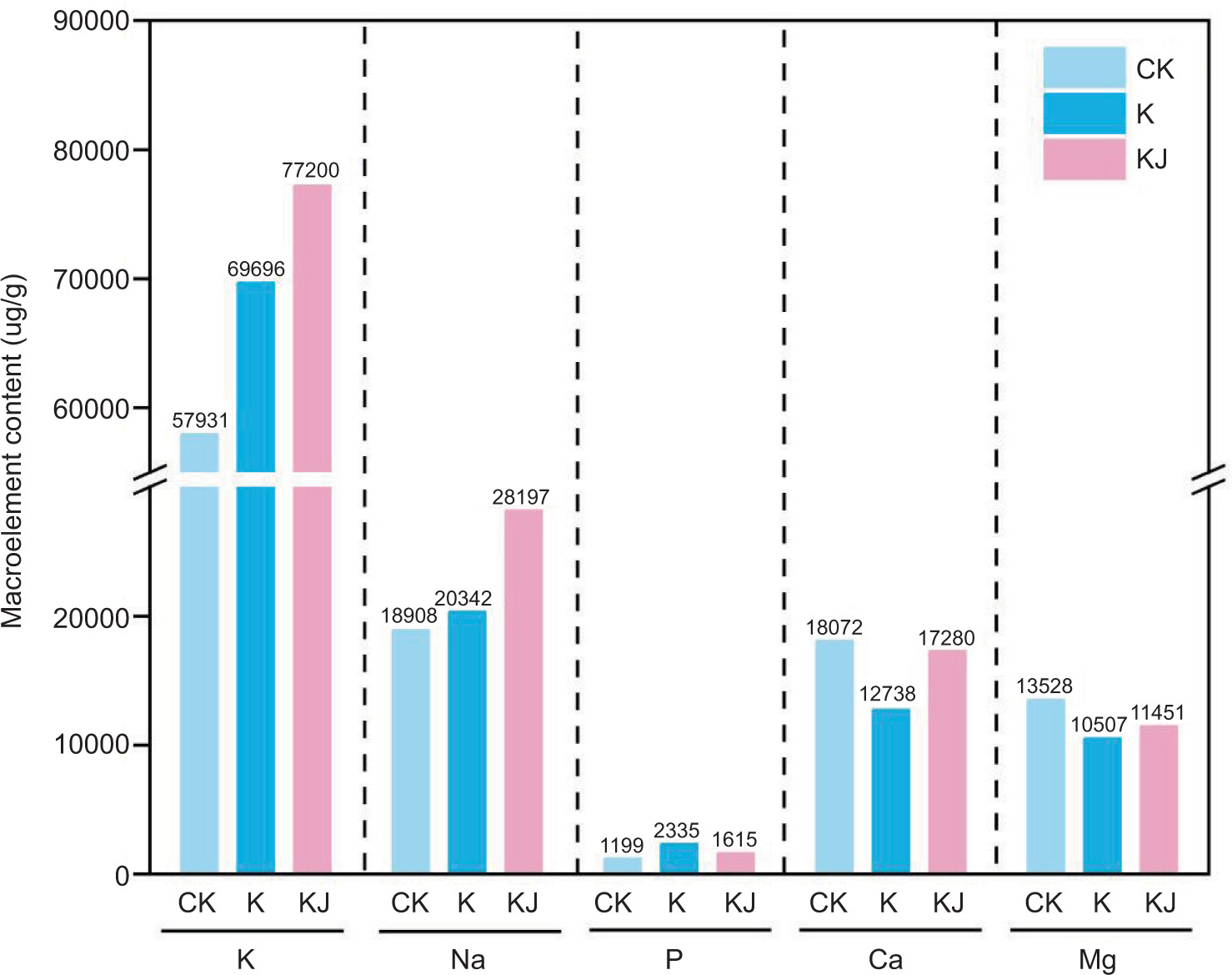 Figure 6. The macroelements in quinoa seedlings of different treatment groups. The numbers in the figure represent the mean values for each treatment group. CK is the control group, K is the application of Kaiduo explosive root microbial agent, KJ is the compound application of Kaiduo explosive root microbial agent and phosphate-solubilizing bacteria.