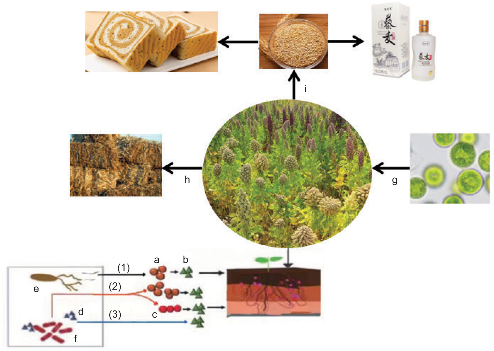 Figure 7. Mechanism of action of phosphorus-dissolving microorganisms on quinoa inter-root soil and prospects for research and development of quinoa. A is insoluble inorganic phosphorus; b is effective phosphorus; c is insoluble organic phosphorus; d is microbial biomass phosphorus; e is AMF; f is PSB; g is salinity-tolerant microalgae; h is quinoa straw that can be processed for composting; i quinoa as a food crop can be eaten directly or made into baked goods or fermented products. (1) Secretions from AMF activate insoluble inorganic phosphorus directly to effective phosphorus; (2) PSB convert insoluble phosphorus into effective phosphorus through direct activation (solubilization and mineralization) and through indirect activation (secretion of plant hormones, biocontrol agents, and nitrogen fixation); (3) PSB produce microbial biomass phosphorus through self-fixation and release effective phosphorus during the fixation-turnover process.