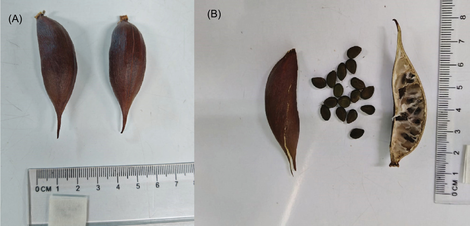 Figure 1. Vachellia caven: (A) fruit and (B) seeds.