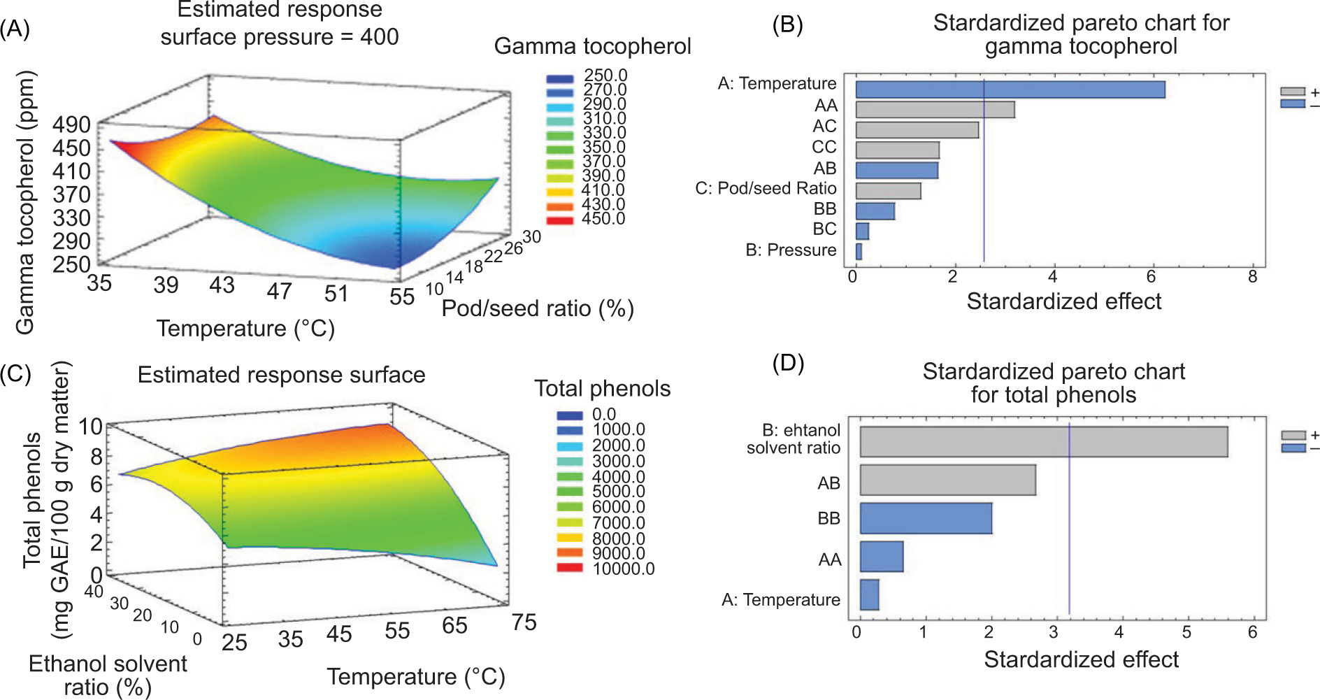 Figure 2. Estimated response surface in (A) Sc-CO2 and (C) ASE extraction process, considering gamma tocopherol and total phenols as response variables, respectively; (B and D) their respective standardized pareto diagrams.