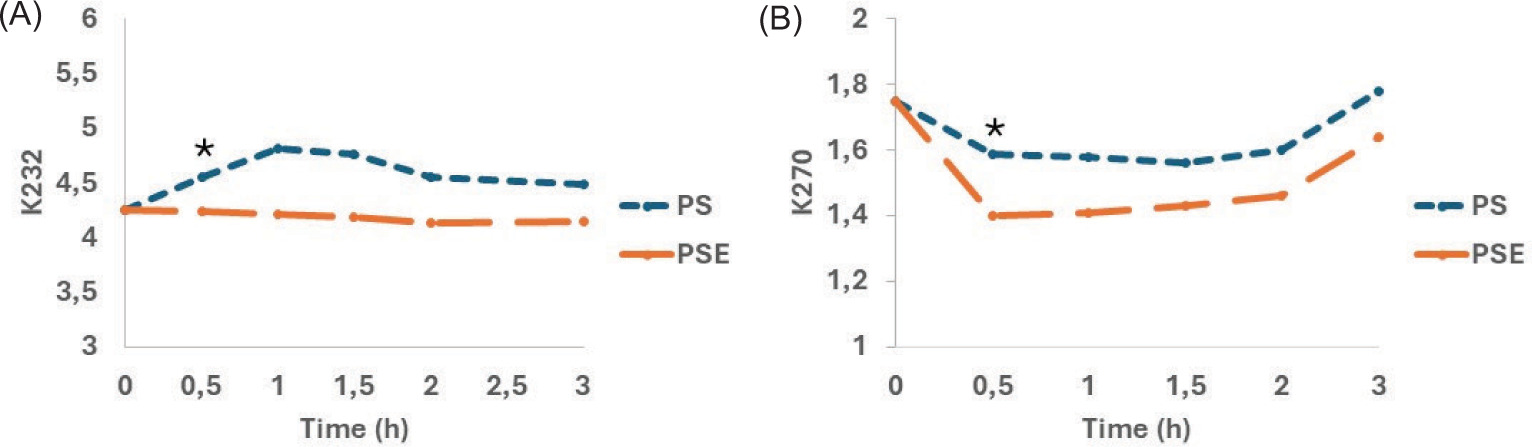 Figure 3 shows the evolution of (A) primary (K232) and (B) secondary (K270) oxidation compounds of model lipid. To avoid misinterpretation of these absorbances, it is advisable to have a lipid matrix without interferents (oleuropein or chlorogenic acid present in olive oil) (Pyrka et al., 2025). For a better understanding of deterioration of lipids, it is necessary to monitor all the compounds formed, because primary compounds, such as hydropexides, are easily degraded, leading to misinterpretation of scientific research, contrary to the greater stability of secondary compounds (ketones and aldehydes) (Flores et al., 2024). It was observed in both A and B cases that from 0.5 h of heating and throughout the heating process, there were significant differences (P < 0.05) in the control sample (PS) with respect to the fortified sunflower oil sample (PSE); in both cases, higher PS produced a greater amount of degradation products, compared to PSE, Therefore, the addition of the extract can be considered as a protective factor for the lipid material.