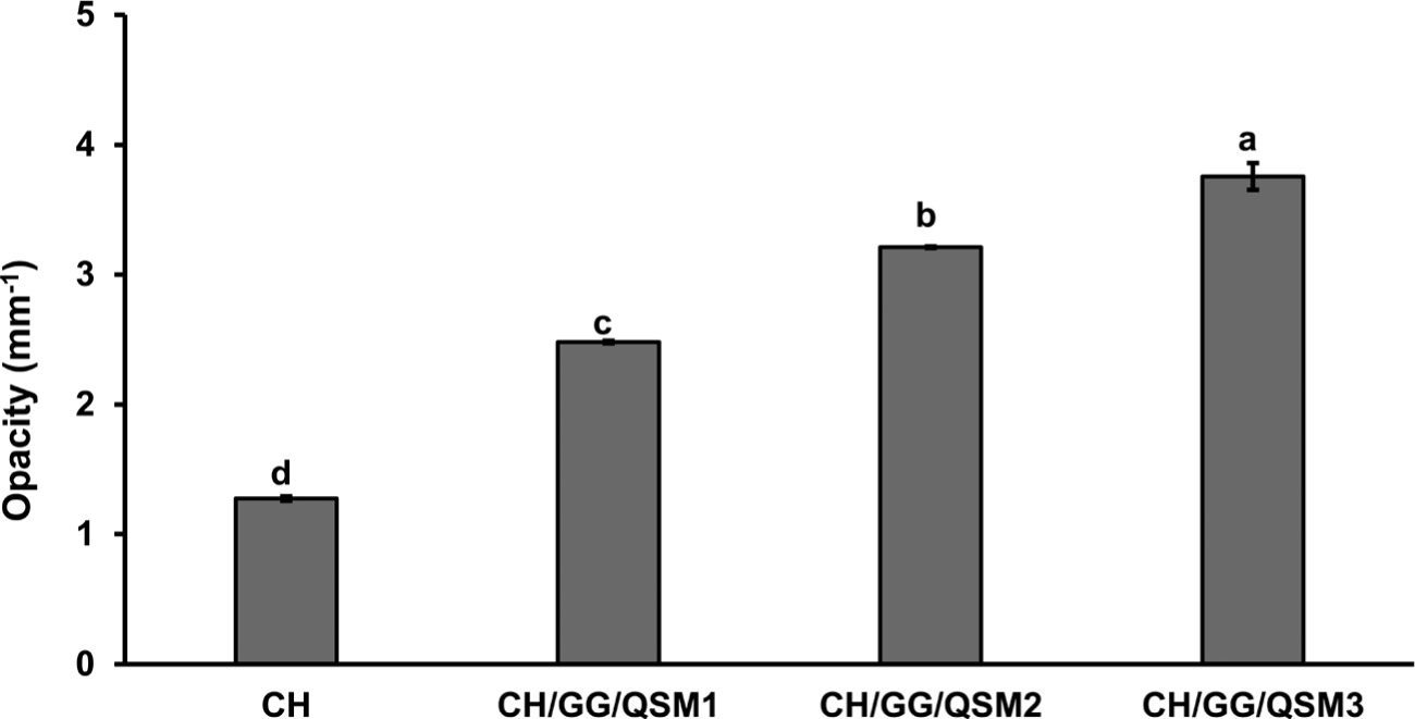 Figure 1. Opacity of CH, CH/GG/QSM1, CH/GG/QSM2, and CH/GG/QSM3 films. (Different letters indicate significant differences, P < 0.05).