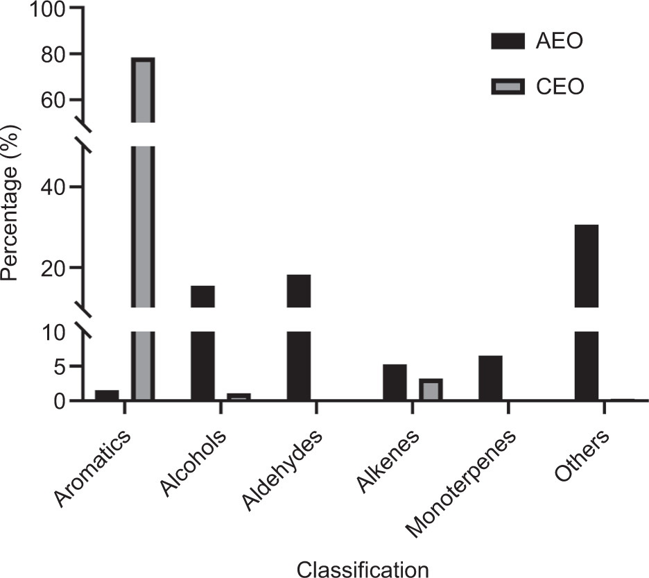 The chemical compositions of AEO and CEO were -analyzed by GC–MS on the Agilent Technologies 7890B GC system coupled with a 5977B inert mass selective detector (MSD) and controlled via the Agilent ChemStation software (Agilent Technologies Co. Ltd., Santa Clara, CA, USA). AEO analysis was performed on an Agilent 19091S-433 column (30 m × 0.25 mm × 0.25 μm). Samples (1 µL) were injected by using an Agilent G4513A autosampler in split mode at a ratio of 20:1, with helium acting as a carrier gas at a flow rate of 1.0 mL/min. The GC oven was programmed as follows: initial temperature 60°C held for 5 min, ramped to 110°C at 1°C/min, and held for 5 min, increased to 180°C at 5°C/min and held for 3 min, and finally heated to 240°C at 3°C/min and held for 5 min. Mass spectrometer operated in electron impact (EI) mode with a scan range of 50–800 amu, an ionization energy of 70 eV, and ion source and quadrupole temperatures set at 240°C and 150°C, respectively. CEO analysis followed a similar protocol, with a modified oven program: initial temperature 40°C held for 30 min, then ramped to 220°C at 5°C/min and held for 30 min. Compound identification was achieved by comparing the obtained mass spectra with reference spectra in the NIST 17.L library (National Institute of Standards and Technology, USA; https://webbook.nist.gov), and the relative component abundances were calculated from peak areas using the Mass Hunter B.07.00 software.