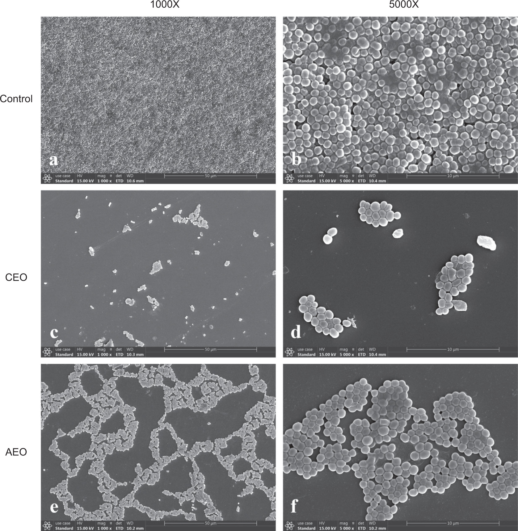 For scanning electron microscopy (SEM) analysis, S. aureus biofilms were formed on glass slides in 8-well chamber slides (400 µL/well) in the presence of AEO (365 μg/mL) or CEO (345 μg/mL). After incubation at 37°C for 24 h, the slides were washed with PBS, fixed with 5% formaldehyde for 5 min, and dehydrated through a graded ethanol series (50%, 70%, 90%, and 100%) for 2 min each. The morphological changes in bacterial cells following essential oil treatment were observed by SEM (Helios G4 UC type, Aztec Live ULTIM; Thermo Fisher).
