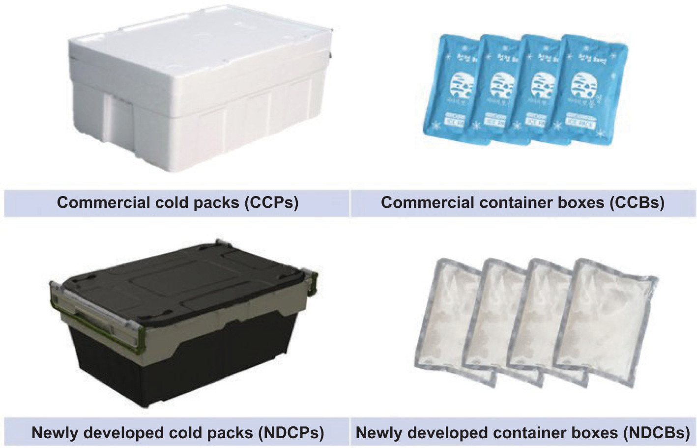 Figure 1. Schematic diagrams of conventional cold packs (CCPs), conventional container boxes (CCBs), newly developed cold packs (NDCPs), and newly developed container boxes (NDCBs) used in this study.