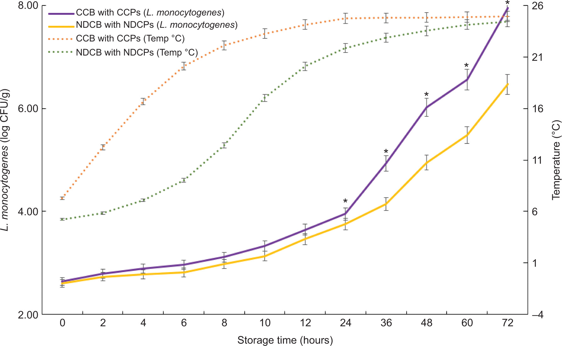 Figure 2. Growth patterns of Listeria monocytogenes in frozen mackerel fillets during 3 days of storage. Two packaging systems were compared: a conventional cold box with conventional cold packs (CCBs with CCPs) and a newly developed cold box with newly developed cold packs (NDCBs with NDCPs). * indicates a significant difference between two packaging systems (t-test, P < 0.05) during storage from 24 to 72 h.