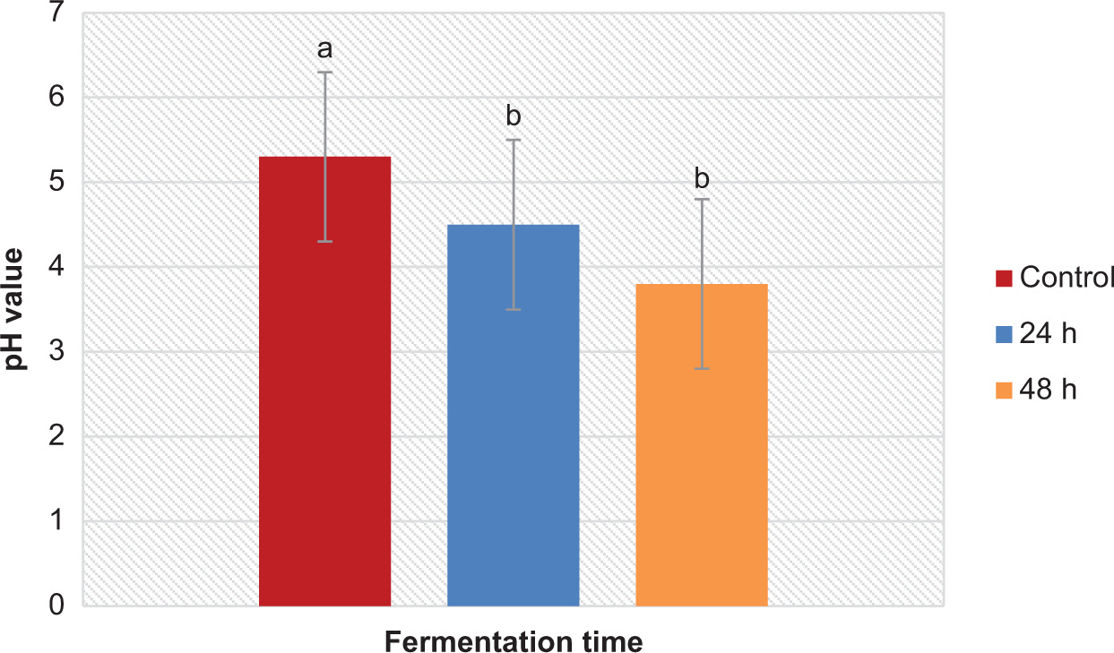 The statistical analysis (ANOVA) indicated no significant difference (p < 0.05) between the reductions achieved by 24-h and 48-h fermentation treatments for both L. monocytogenes and S. typhimurium. This finding suggests that the shorter fermentation duration of 24 h is sufficient to reach effective microbial reduction, with no additional benefit observed by extending fermentation to 48 h. Such results highlight the efficiency of the fermentation process within a relatively short timeframe, which could be advantageous for industrial applications by reducing processing time and cost.
