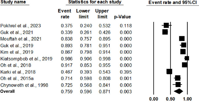 | Overall | 10 | 934 | 654 | 75.9 | 59.6 | 87.1 | 1.364 | 177.897 | 94.941 | <0.001 |