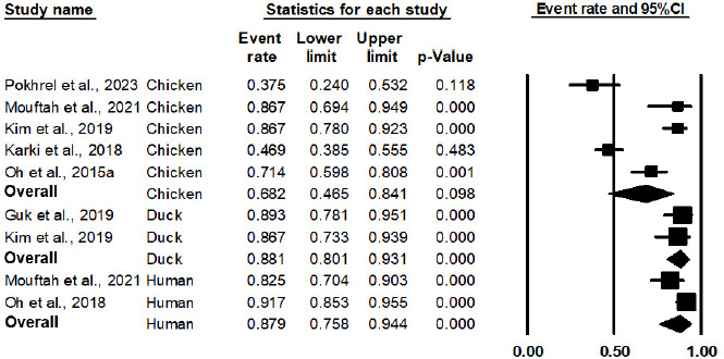 As shown in Figure 2 and Table 3, the pooled prevalence of AT Campylobacter spp. from 10 studies in a meta-analysis was 75.9% (95% CI: 59.6% to 87.1%, P = 0.003). The outputs of the subgroup analysis are shown in Figure 3 and Table 3; the pooled prevalence of AT Campylobacter spp. in chicken was 68.2% (95% CI: 46.5% to 84.1%, P = 0.098). As a comparison, the pooled prevalence of AT Campylobacter spp. in duck and humans was statistically significant (P < 0.001), with a pooled prevalence of 88.1% (95% CI: 80.1% to 93.1%) and 87.9% (95% CI: 75.8% to 94.4%), respectively. Based on meta-regression, as shown in Table 4, no statistically significant difference exists in the prevalence of AT Campylobacter spp. between chicken and duck, with P = 0.1226, and between chicken and humans, with P = 0.1165. Owing to the limitation of a 30-sample size in the respective studies, the source of AT Campylobacter spp., such as beef, dairy products, the environment, and turkey, were not included in the meta-analysis. This implies that further studies involving larger sample sizes from different sources are noteworthy for meta-analysis in the future.