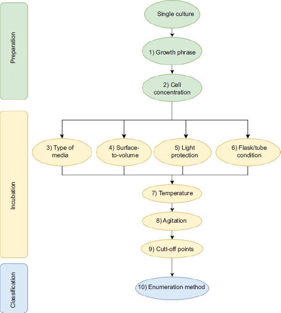 While the majority of the researchers adopted the method reported by Oh et al. (2015a), the protocol did not specify details, such as the surface-to-volume ratio of MH broth during aerobic incubation. Aerotolerance study in Campylobacter spp. is relatively new. Thus, a standardized method for determining the level of aerotolerance is crucial for inter-laboratory comparison, which may consider the following aspects: (1) growth phase of the inoculating culture (after certain hours of incubation); (2) cell concentration; (3) type of inoculating media; (4) aerobic stress of incubation, such as the surface-to-volume ratio of the media; (5) incubation flask/tube is protected from light/unprotected; (6) incubation flask/tube is tightened/cracked/loosened/left open; (7) incubation temperature; (8) degree and type of agitation during incubation; (9) cut-off points for aerobic incubation duration for aerotolerance level classification; and (10) enumeration method. The schematic diagram for the standardization protocol is shown in Figure S1.