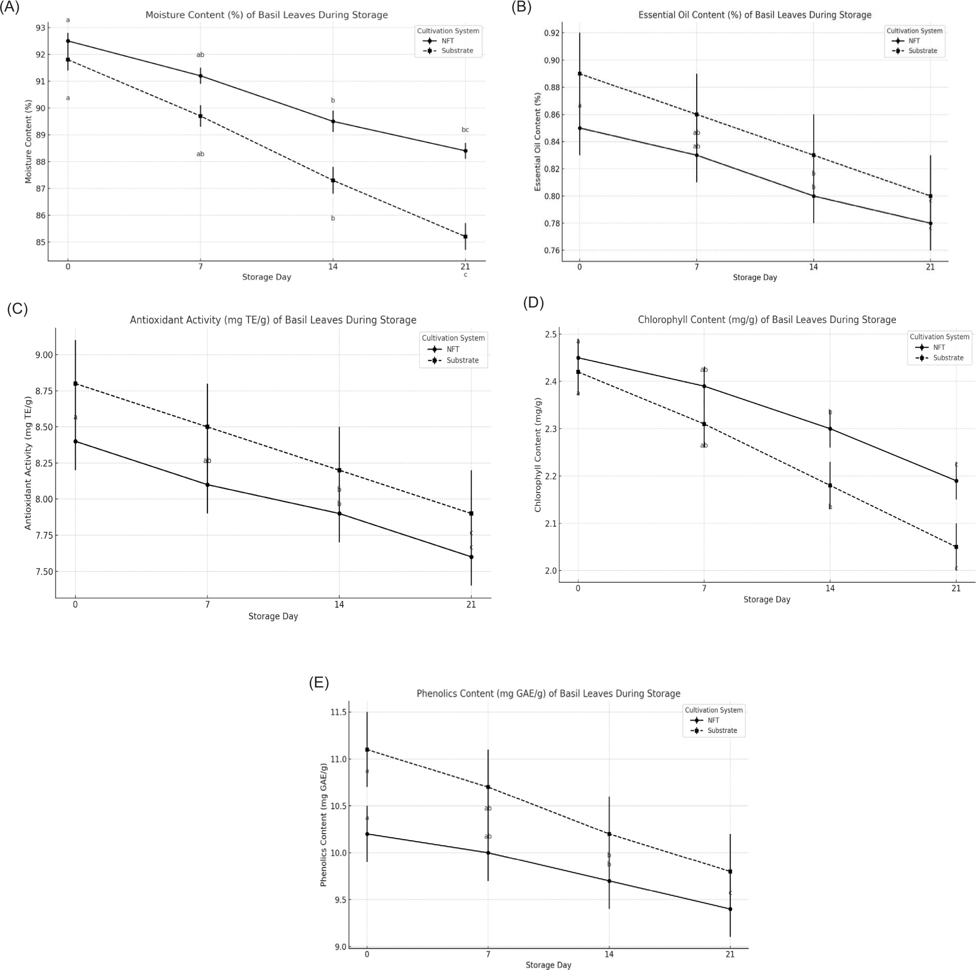 This study presents, for the first time, a comprehensive comparison between two hydroponic cultivation systems Nutrient Film Technique (NFT) and substrate-based culture regarding the postharvest quality and shelf life of Ocimum basilicum (sweet basil) stored for 21 days at 5 ± 1 °C. Physical (weight loss, color, firmness), -chemical (essential oils, total phenolics, antioxidant activity, chlorophyll content), and microbial (total plate counts, yeast, and mold) attributes were systematically evaluated. NFT-grown basil exhibited superior physical stability, with significantly lower weight loss (7.5 % vs. 11.2 %) and higher firmness at Day 21 (p < 0.05). In contrast, substrate-grown basil accumulated higher levels of essential oils and total phenolics (by 21 % and 18 %, respectively), reflecting enhanced secondary metabolism. Microbial results showed that NFT basil maintained total plate counts below 5.1 log CFU g–1, whereas substrate basil reached 6.2 log CFU g–1, exceeding the international safety threshold (106 CFU g–1; ISO 4833-1:2013; FDA, 2023). Overall, the comparative assessment established clear relationships among physical, chemical, and microbial quality indices, confirming that NFT basil retained acceptable sensory and microbial quality for up to 21 days. These findings highlight system-dependent trade-offs between postharvest stability and phytochemical enrichment, offering new insights for optimizing hydroponic basil production to meet targeted quality and market requirements.
