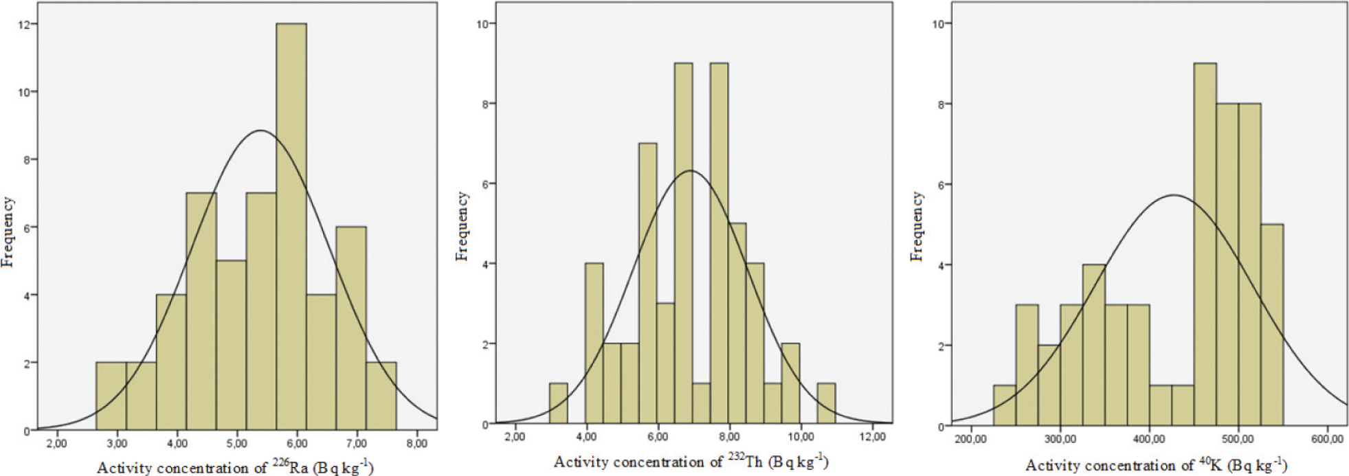 The activity concentrations of 226Ra, 232Th and 40K measured in each groundnut sample and the statistical data for these activity concentrations are presented in Tables 1 and 2, respectively. In addition, frequency histograms of the radionuclide activity concentrations are shown in Figure 2. The values for skewness and kurtosis of data distribution were in the range of −0.1 and −0.9, respectively. These values indicated normality of data distribution. The activity concentrations of 226Ra, 232Th and 40K in groundnut samples varied from 2.9 to 7.6 Bq kg−1, with an average of 5.4 Bq kg−1; 3.2–10.7 Bq kg−1, with an average of 6.9 Bq kg−1 and 246.3–541.8 Bq kg−1, with an average of 427.1 Bq kg−1, respectively. The highest 226Ra activity concentration was measured in the groundnut sample from Düziçi Village (Osmaniye), whereas the lowest was measured in the sample from Kürkçüler Village (Adana). The highest 232Th activity concentration was measured in the groundnut sample from Burhanlı Village (Ceyhan-Adana), whereas the lowest was measured in the sample from Düziçi Village (Osmaniye). The highest 40K activity concentration was measured in the groundnut sample from Karataş Village (Adana), whereas the lowest was measured in the sample from Çakaldere Village (Ceyhan-Adana).