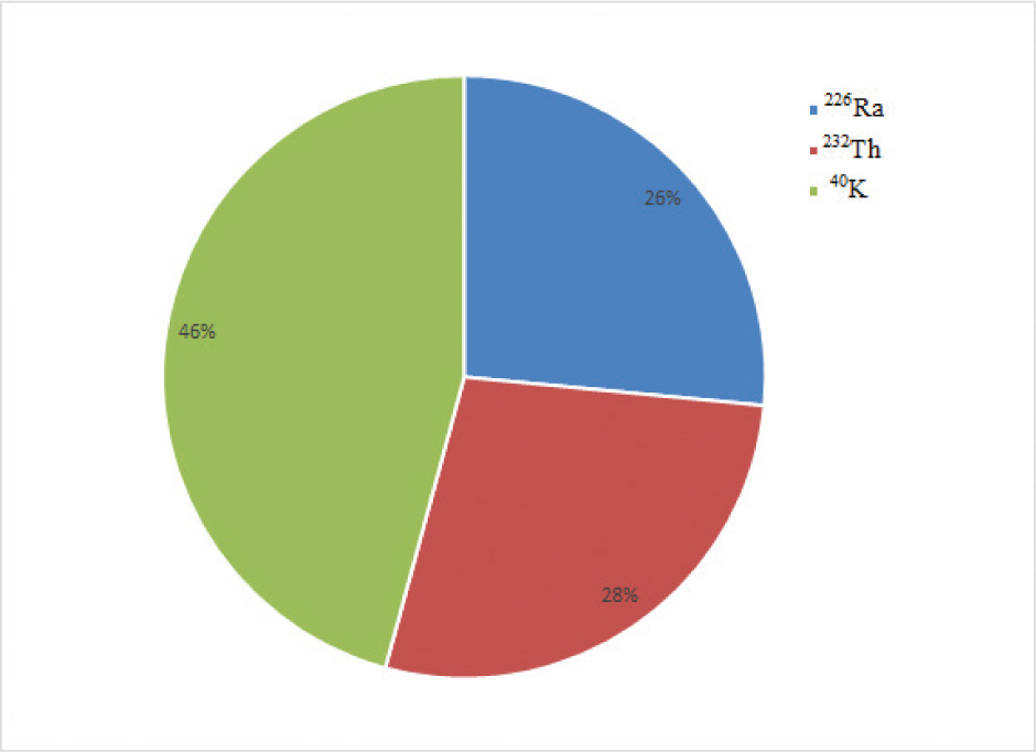 The values of DEff estimated for groundnut samples varied from 6.5 to 10.1 µSv y−1, with an average value of 8.4 µSv y−1. This was significantly lower than the global average annual effective dose of 300 µSv y−1 for internal exposure by ingesting food or water containing the radionuclides (UNSCEAR, 2000). The ratio of contribution of 226Ra, 232Th and 40K to total annual effective dose was 2.2, 2.3 and 3.8 µSv y−1, respectively (Figure 3). As indicated in Figure 3, 40K provides a significant contribution to total annual effective dose.