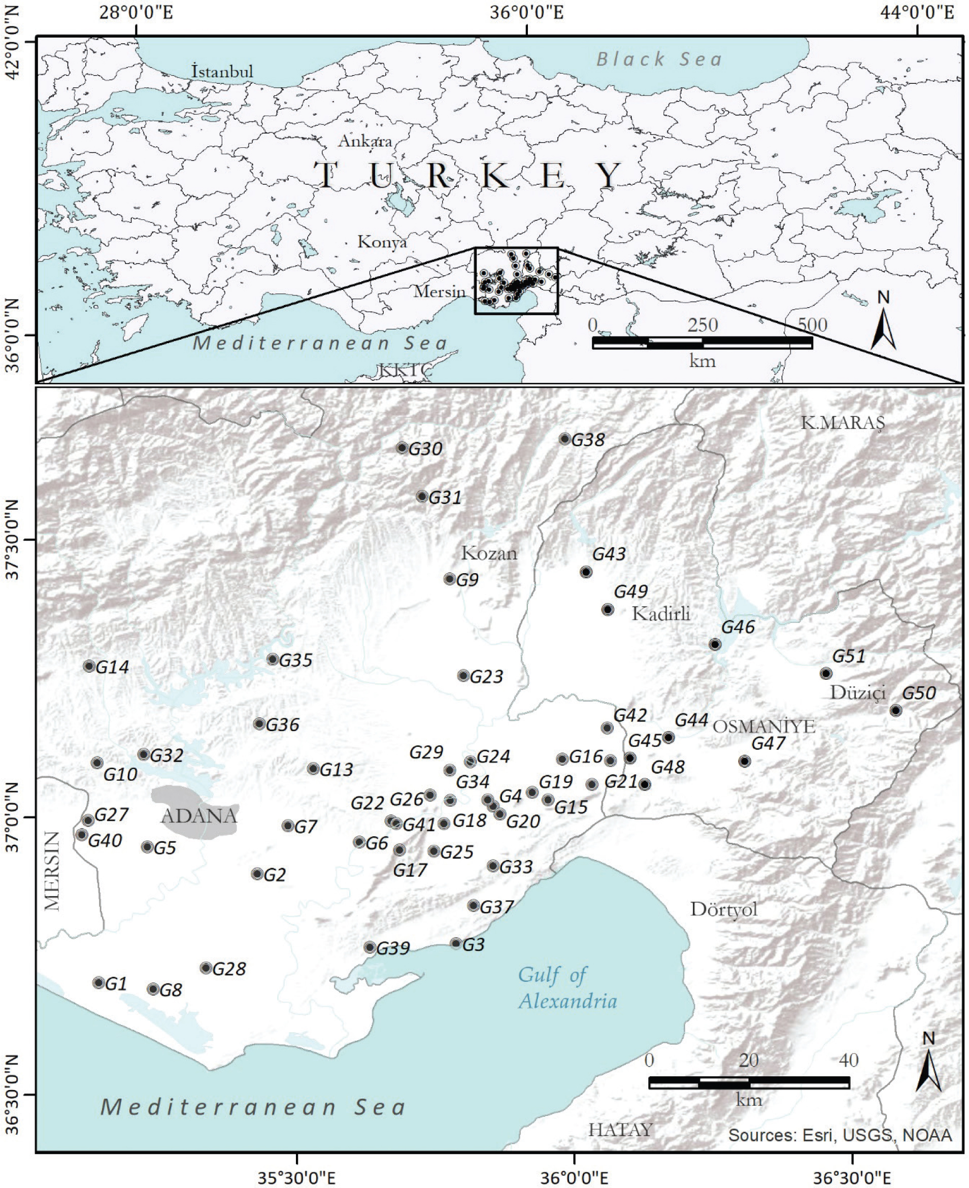 Fifty-one groundnut samples were collected from different fields located in Adana and Osmaniye in the Mediterranean region of Turkey (Figure 1), the two cities that produce most of Turkey's groundnut yield. In 2016, ~90% of the total groundnut production in Turkey was from Adana (60%) and Osmaniye (30%) (TUİK, 2017).