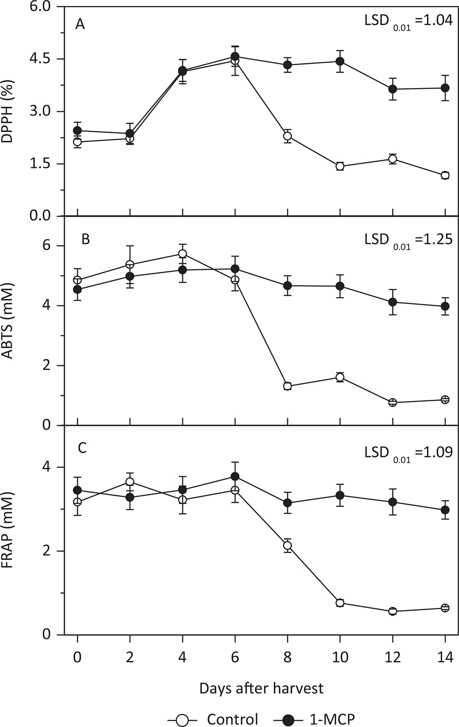 Figure 5. Effects of different treatments on the antioxidant activities of (A) 2,2-diphenyl-1-picrylhydrazyl (DPPH), (B) 2,2-azino-bis-3-ethylbenzothiazoline-6-sulphonic acid (ABTS) and (C) ferric reducing antioxidant power (FRAP) assays of ‘Hujingmilu’ peach fruit during ripening at shelf-life temperature.
