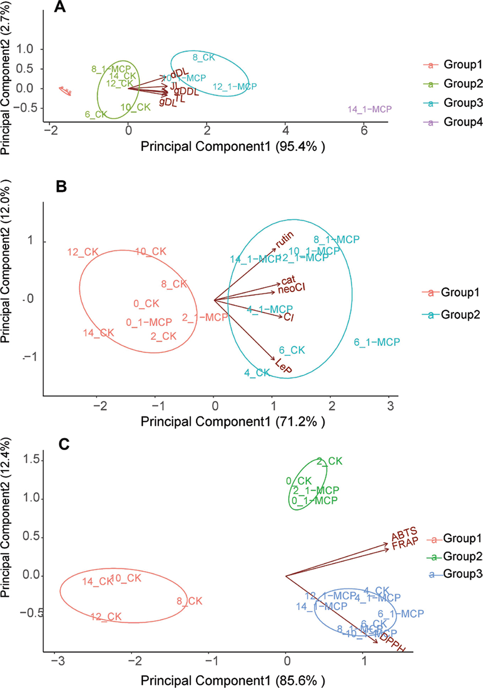 Figure 6. Principal component analysis models of (A) aroma volatiles, (B) polyphenols and (C) antioxidant activities for the control (CK) and 1-MCP treated samples. TL, total lactone; gDL, δ-decalactone; dDL, δ-octalatone; JL, jasmine lactone; gDDL, γ-dodecalactone; CI, chlorogenic acid; LeP, L-epicatechin; cat, catechin; rutin, quercetin-3-rutinoside; neochlorogenic acid. 0–14 represents the storage day.