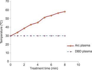Figure 4. Variations in the temperature of chlorpyrifos during arc and dielectric barrier discharge (DBD) plasma treatments.