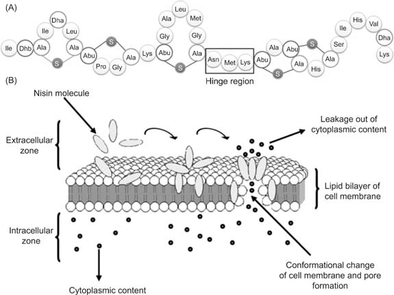 Figure 3. (A) Structure of nisin A. Dhb, dehydrobutyrine; Dha, dehydroalanine; Abu-S-Ala, β-methyllanthionine; Ala-S-Ala, lanthionine; Hinge region (Asn-Met-Lys) (42). (B) Mechanism of action of nisin in the cell of bacteria (45).