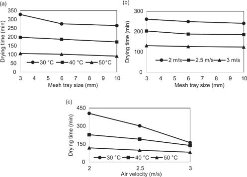 Figure 2a shows the interaction effect of mesh size and velocity. The slope of variations in mesh size versus drying time was calculated. For the velocity of 2, 2.5, and 3 m/s, the slopes were calculated to be 2.86, 2.54, and 0.96, respectively, whereby it can be concluded that a higher air velocity reduces the effect of mesh size on the drying time. This may be because, at a higher velocity, the airflow rate is sufficient to increase heat transfer into the drying sample and thus increase the removal rate of moisture from the drying materials. However, with a lower air velocity, an increase in mesh tray size would lead to a reduction in the resistance against the passing air, and, therefore, with a lower air velocity, the effect of mesh tray size on the drying time is increased.