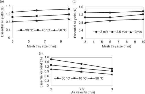 Figure 3b shows the interaction effect of mesh size and air temperature on essential oil content.
