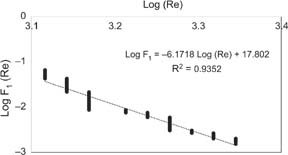 In order to find the Log (F1) to Log(F4), first, we plotted the Log (Mw/(Mw + Ms)) against the Log (ṁs/ṁf) for each replication of the experiment (Figure 4). Then, the points with the same values of Log (Re) were recognized and connected to create different parallel lines. The vertical distance of each line from the origin was calculated and considered as the change rate of Log (F1 (Re)) (Karparvarfard and Rahmanian Kushkaki, 2015). Therefore, the values of Log(F1(Re)) were plotted against the amounts of Log (Re), as shown in Figure 5, and then the best-fitted Equation was obtained. Figure 5 shows the relation between Log (Re) and Log (F1(Re)) for the first replication of the experimental data. The process was replicated for three replications of experimental data, and an average equation, called Equation (6), was obtained: