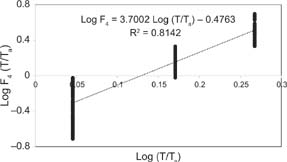 Then, as done before, the Log F4(T/Ta) versus Log (T/Ta) was plotted, and the best-fitted Equation was obtained for each replication of the experimental data. Figure 8 shows the relationship between Log F4(T/Ta) versus Log (T/Ta), which is provided from the first replication of the experimental data. Equation (15) is an average value of three equations.