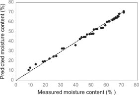 Figure 10. Predicted moisture content of lemon verbena leaves versus measured moisture content (wet basis).