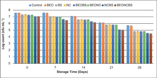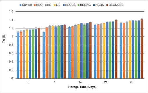 Parallel to the decrease in pH value, TA was considerably increased. Control and BEO samples had the lowest content of pH in comparison to other treatments. In terms of pH and TA values, there were no considerable differences between control and BEO treatments during the 28 days storage period (P > 0.01) (Figures 3 and 4).