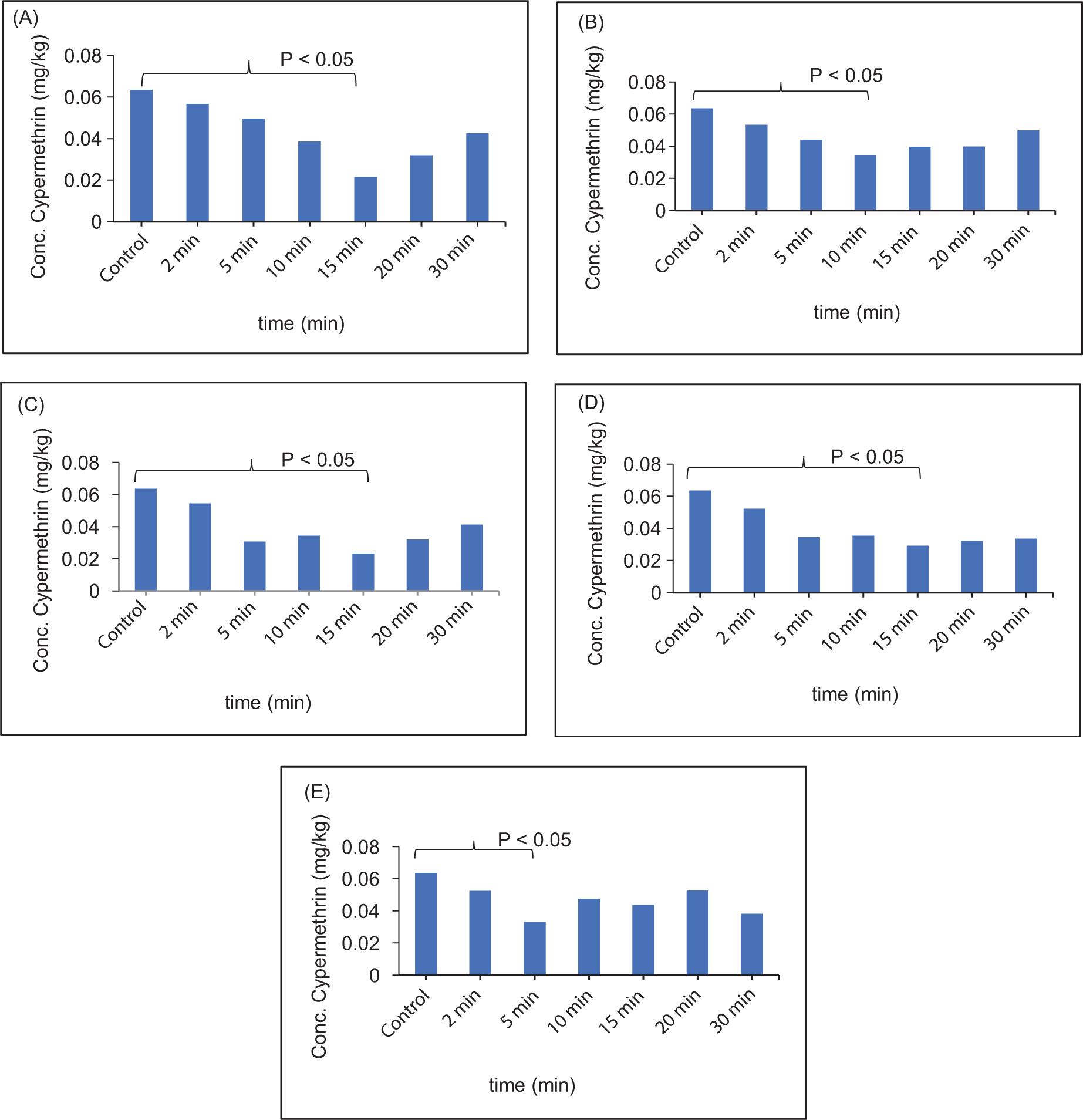 Figure 2. Effect of time on cypermethrin reduction by using various household processes. A = Normal water. B = 0.10 % NaCl. C = Baking Soda. D = Water flowing through. E = Blanching.