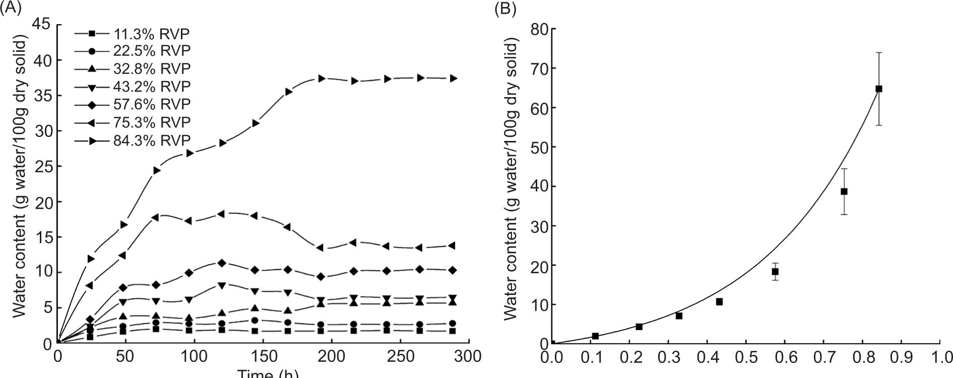 Puff-dried yellow peach powder (100 mg) was prepared in an aluminum pack and stored in a vacuum dryer at ambient temperature (25°C) for 288 h, which contained different saturated salt solutions: LiCl, CH3COOK, MgCl2, K2CO3, NaBr, NaCl, and KCl with RVP of 11.3, 22.5, 32.8, 43.2, 57.6, 75.3, and 84.3%, respectively (Greenspan, 1977). Before weighing, each package was covered with a lid to minimize the transfer of water released from the vacuum dryer through the air. The powder sample was weighed at each 24-h interval and water content of each sample as a function of time was taken from the average weight of triplicate samples.