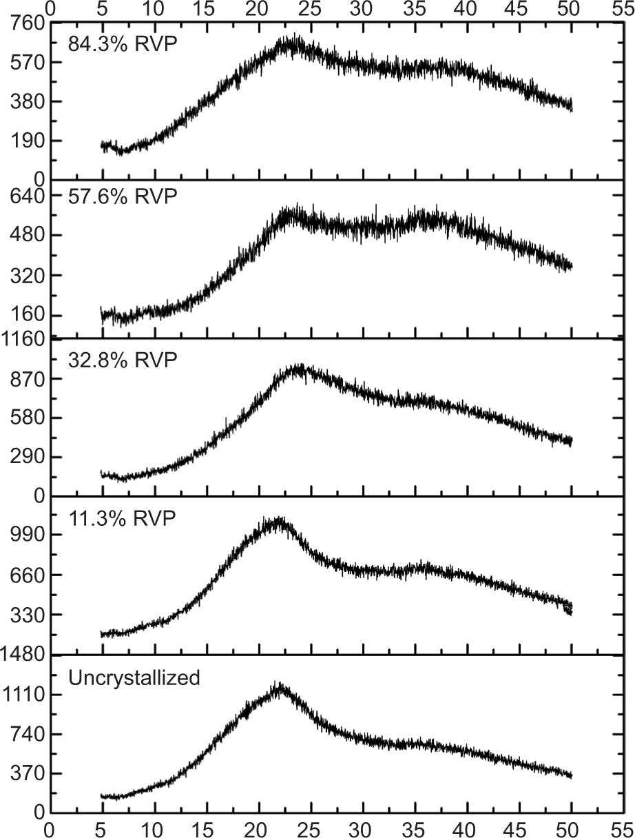 Figure 2. X-ray diffraction patterns of puff-dried yellow-fleshed peach powder during the 8-day storage at 25 oC under different RVP conditions: (A) un-crystallized samples; (B) 11.3% RVP; (C) 32.8% RVP; (D) 57.6% RVP; (E) 84.3% RVP.