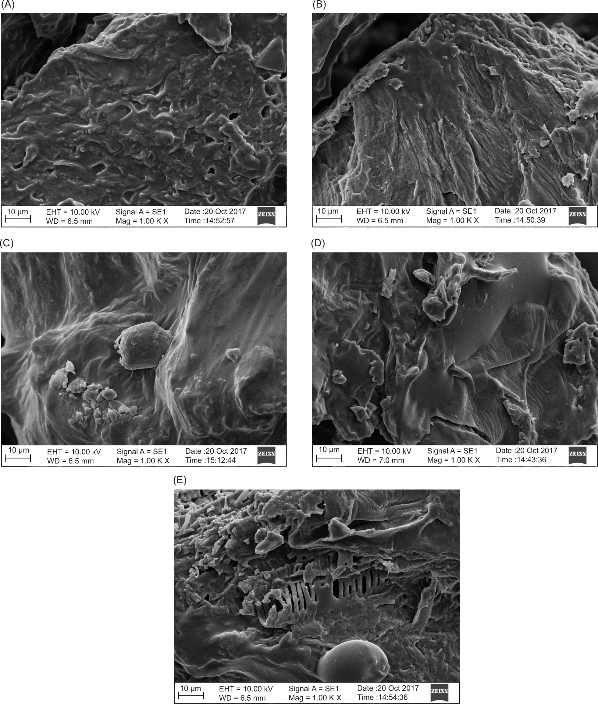 Figure 3. Scanning electron micrographs of puff-dried yellow-fleshed peach powder during the 8-day storage at 25 oC under different RVP conditions: (A) un-crystallized samples; (B) 11.3% RVP; (C) 32.8% RVP; (D) 57.6% RVP; (E) 84.3% RVP.