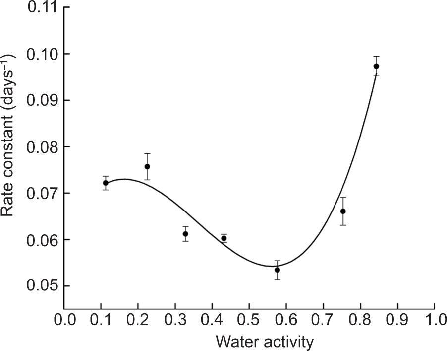 However, when the fruit powder was stored above aw 0.753, the degradation rate of carotenoids increased, and the highest rate constant was determined at aw 0.843. This was attributed to the water absorption between the randomly spaced molecules in the noncrystalline system, which increased the oxidation rate by increasing the fluidity of the reactants (Alves et al., 2010; Lavelli et al., 2007). Obviously, the loss of carotenoids was related with the water absorption and crystallization of the sugar matrix from the powder. Buera et al. (2005) explained that when the matrix was amorphous, chemical reactions were delayed because the reactants were diluted in a highly viscous medium. Elizalde et al. (2002), and Harnkarnsujarit and Charoenrein (2011) found that matrix crystallization resulted in the loss of some encapsulated bioactive compounds, which made them more susceptible to oxygen exposure and subsequent degradation.