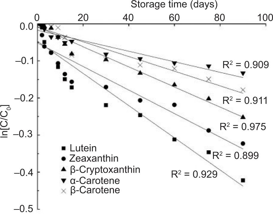 Pseudo-first-order kinetics equation: ln(C) = ln (C0) – kt; C, individual carotenoid content in yellow-fleshed peach powder (µg/g d.w.) during storage;k, rate constant;R, correlation coefficient