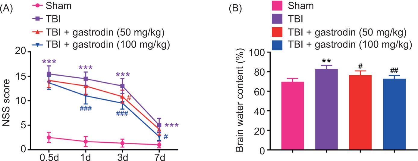 Figure 1. Gastrodin alleviates brain injury in TBI rats. (A) The NSS score of brain in the sham, TBI, TBI + gastrodin 50 and 100 mg/kg groups. (B) The brain water content in the sham, TBI, TBI + gastrodin 50 and 100 mg/kg groups. **p< 0.01, ***p< 0.001 versus sham group; #p< 0.05, ##p< 0.01, ###p< 0.001 versus TBI group.