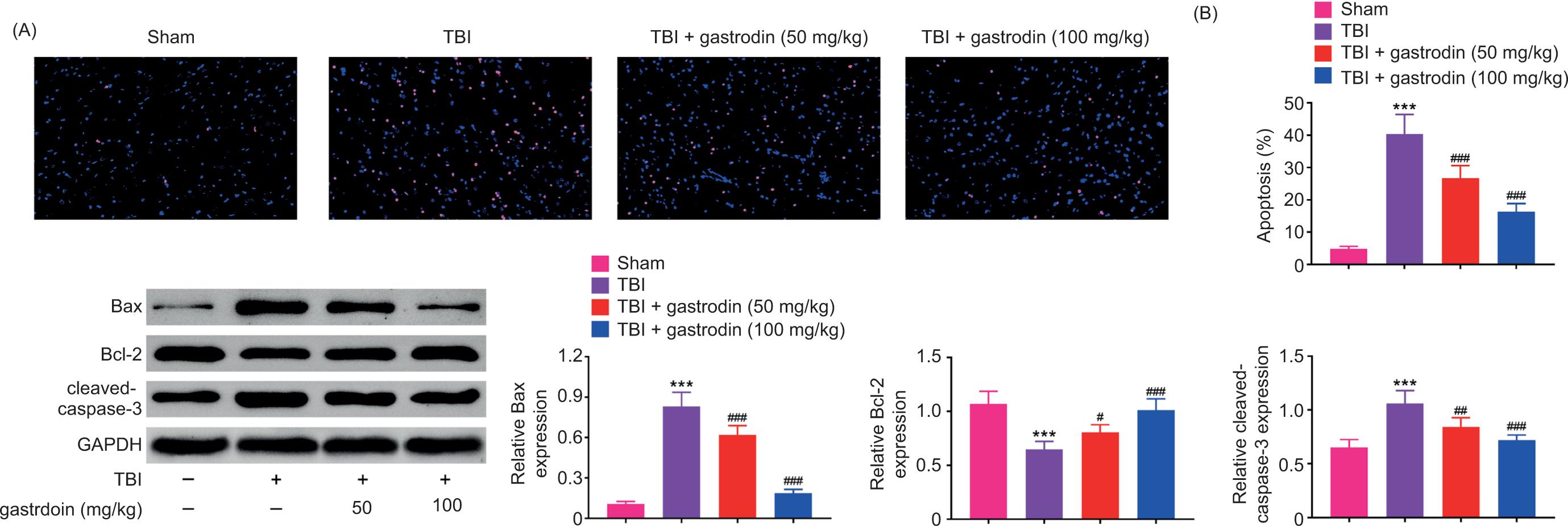 Figure 2. Gastrodin reduced inflammatory responses in the brain of TBI rats. (A) The TUNEL staining in the brain of sham, TBI, TBI + gastrodin 50 and 100 mg/kg groups. (B) The protein expressions of Bax, Bcl-2, and cleaved-caspase 3 in sham, TBI, TBI + gastrodin 50 and 100 mg/kg groups. ***p< 0.001 versus sham group; #p< 0.05, ##p< 0.01, ###p< 0.001 versus TBI group.