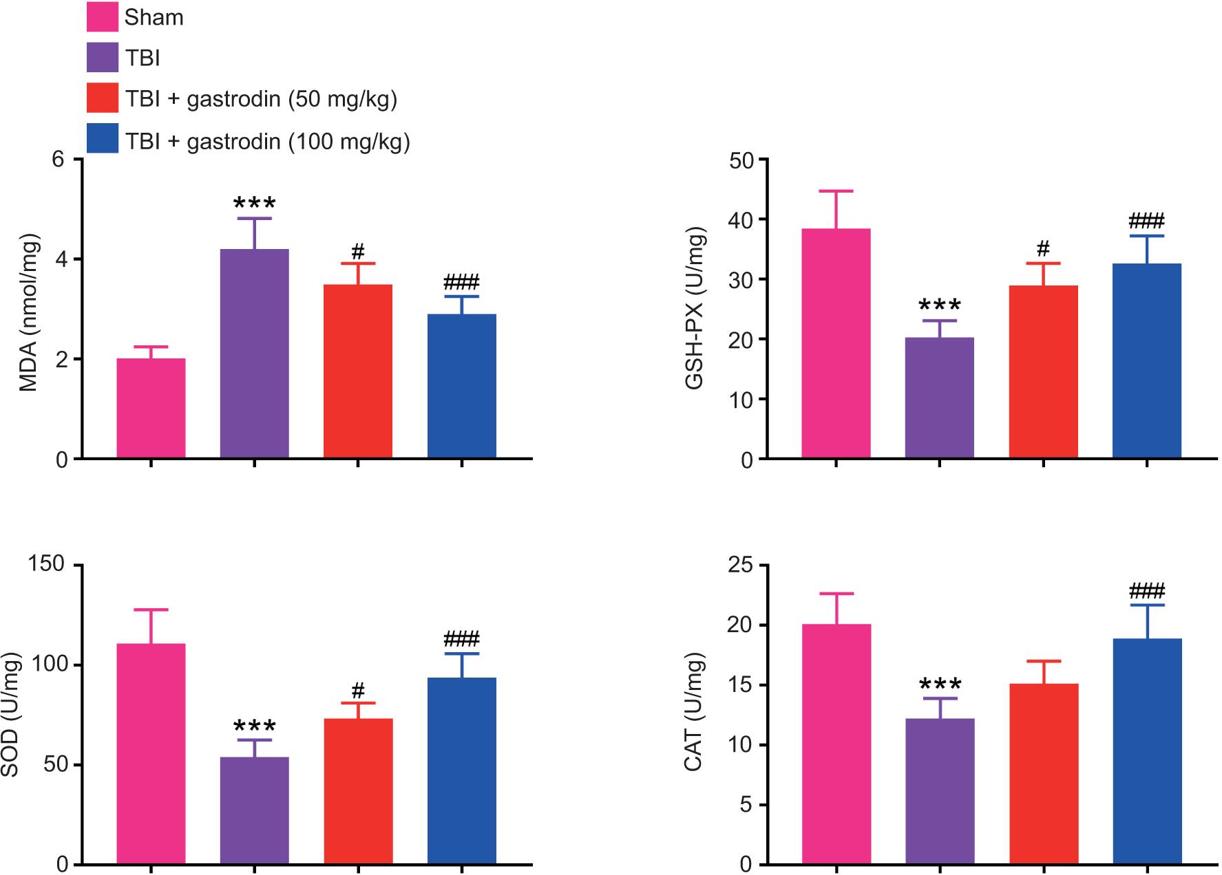 Figure 3. Gastrodin repressed oxidative stress in the brain of TBI rats. The levels of MDA, GSH-px, SOD, and CAT in the brain of sham, TBI, TBI + gastrodin 50 and 100 mg/kg groups. ***p< 0.001 versus sham group; #p< 0.05, ###p< 0.001 versus TBI group.