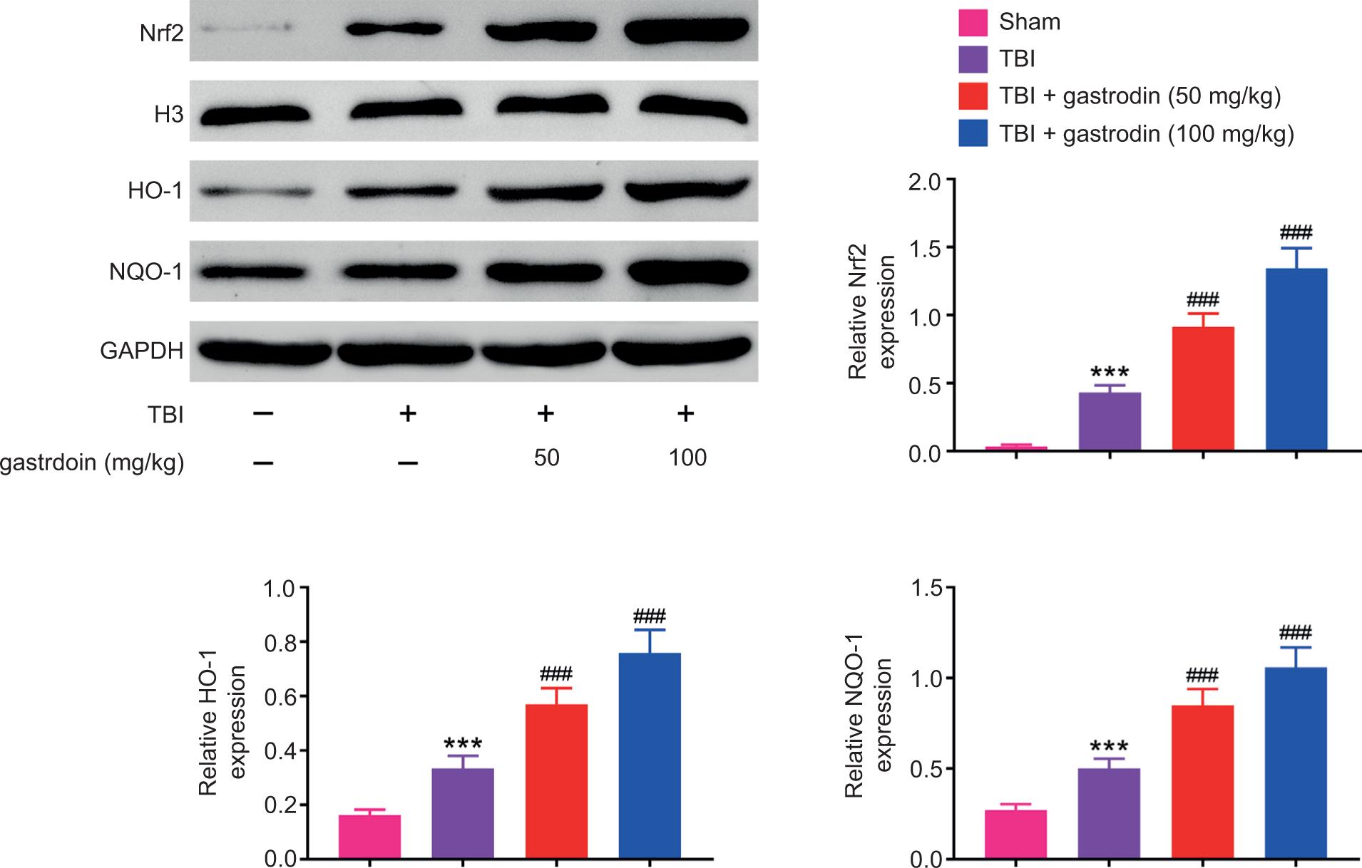 Figure 4. Gastrodin suppresses NLRP3 inflammasome signaling pathway in the brain of TBI rats. The protein expression levels of Nrf2, H3, HO-1, and NQO-1 in the brain of sham, TBI, TBI + gastrodin 50 and 100 mg/kg groups. ***p< 0.001 versus sham group; ###p< 0.001 versus TBI group.