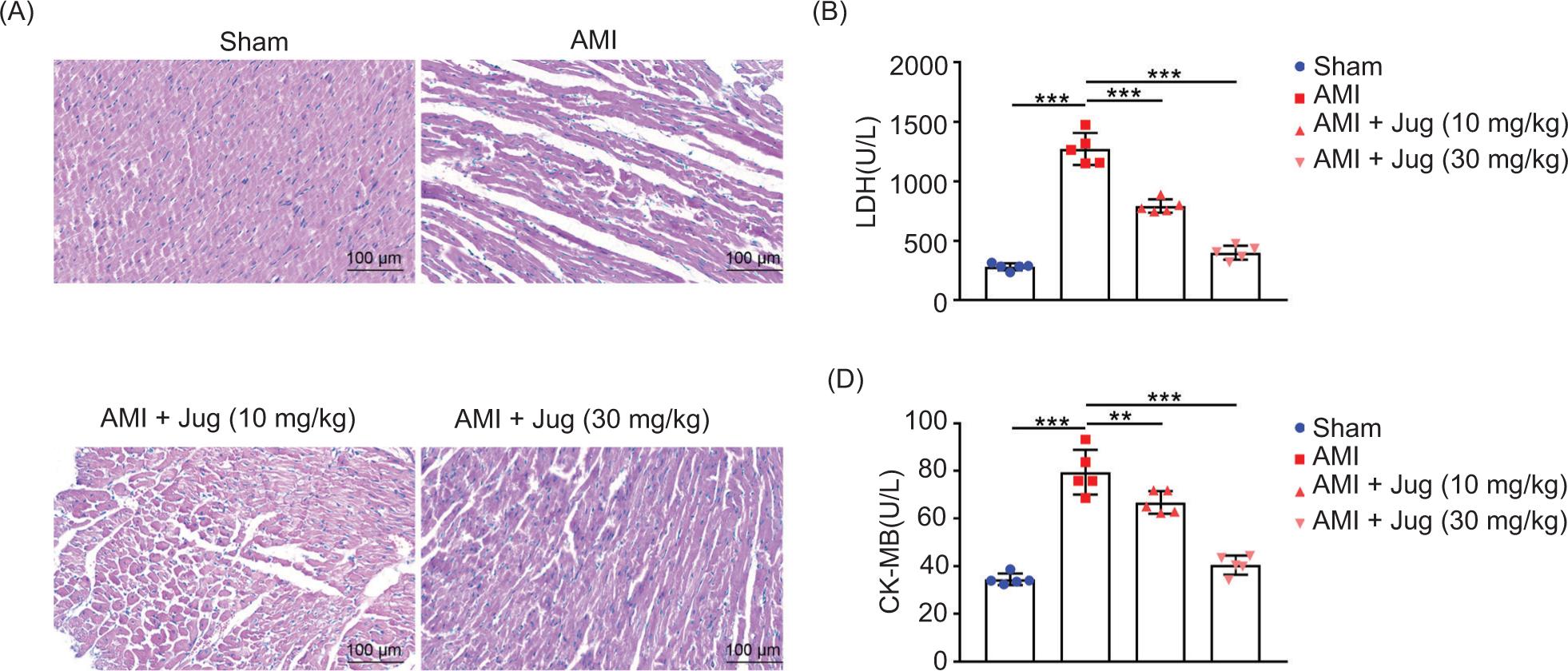 Figure 1. Juglanin alleviated AMI-induced myocardial injury in rats. (A) Morphological changes induced by AMI improved in AMI rats treated with 10-mg/kg and 30-mg/kg Juglanin; (B) increment of LDH induced by AMI was inhibited in AMI rats treated with 10-mg/kg and 30-mg/kg Juglanin; (C) increment of CK-MB induced by AMI was inhibited in AMI rats treated with 10-mg/kg and 30-mg/kg Juglanin. **P < 0.01 versus the Sham or AMI group; ***P < 0.005 versus the Sham or AMI group. AMI: acute myocardial infarction; Jug: Juglanin; LDH: lactate dehydrogenase; CK-MB: creatine kinase myocardial band.