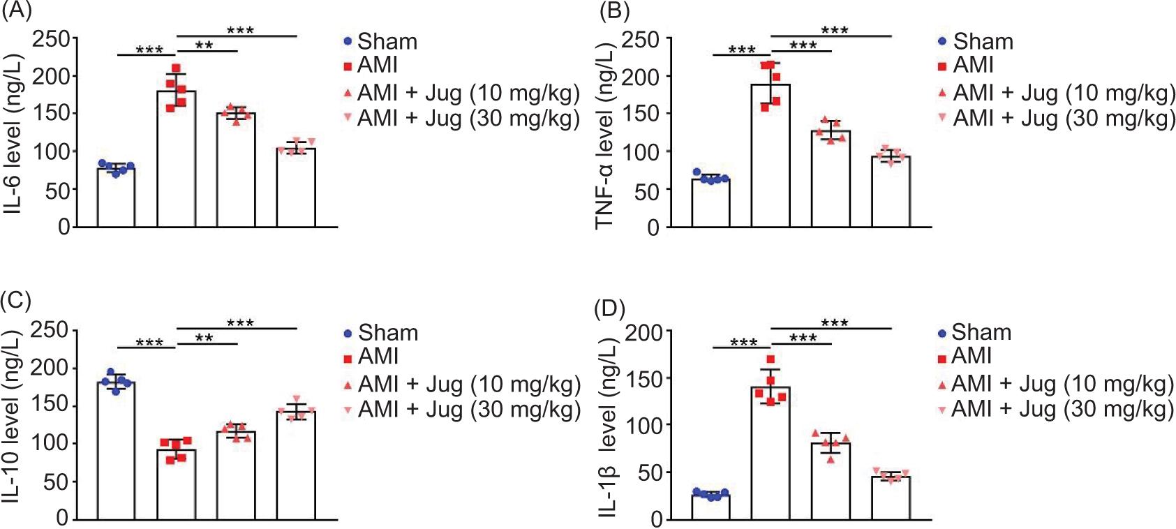 Figure 2. Juglanin inhibited inflammatory response in AMI rats. (A) Increment of serum IL-6 was inhibited by 10-mg/kg and 30-mg/kg Juglanin in AMI rats; (B) increment of serum TNF-α was inhibited by 10-mg/kg and 30-mg/kg Juglanin in AMI rats; (C) reduction of serum IL-10 was inhibited by 10-mg/kg and 30-mg/kg Juglanin in AMI rats; (D) increment of serum IL-1β was inhibited by 10-mg/kg and 30-mg/kg Juglanin in AMI rats. ***P< 0.005 versus the Sham or AMI group. IL: interleukin; TNF-α: tumor necrosis factor alpha.