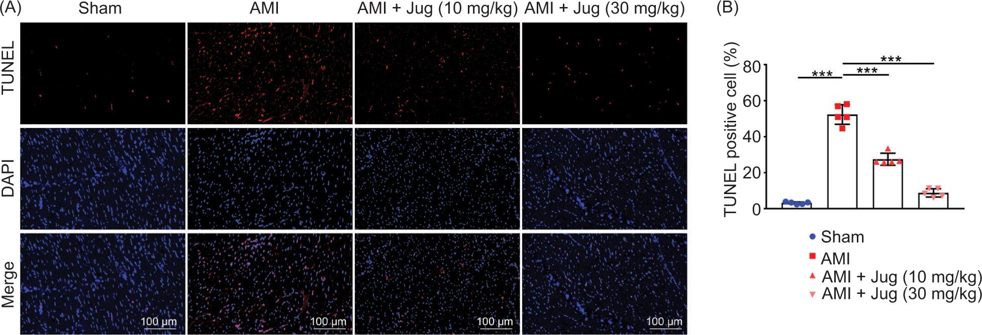 Figure 3. Juglanin inhibited myocardial apoptosis in AMI rats. Juglanin (10 mg/kg and 30 mg/kg) reduced the number of TUNEL-positive cells in AMI rats. ***P< 0.005 versus the Sham or AMI group.