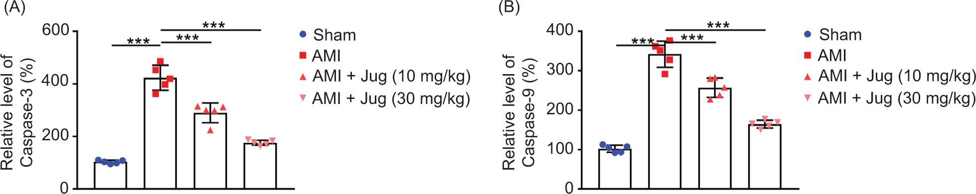 Figure 4. Juglanin reduced the activity of Caspase-3 and Caspase-9. (A) Juglanin (10 mg/kg and 30 mg/kg) reduced Caspase-3 activity in AMI rats; (B) Juglanin (10 mg/kg and 30 mg/kg) reduced Caspase-9 activity in AMI rats. ***P< 0.005 versus the Sham or AMI group.