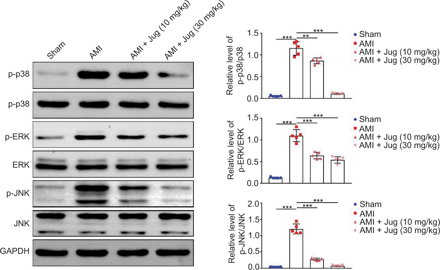 Figure 5. Juglanin regulated MAPK signaling pathways. The phosphorylation of p38, EKR and JNK induced by AMI was down-regulated in AMI rats treated with 10-mg/kg and 30-mg/kg Juglanin. **P < 0.01 versus the Sham or AMI group; ***P < 0.005 versus the Sham or AMI group.