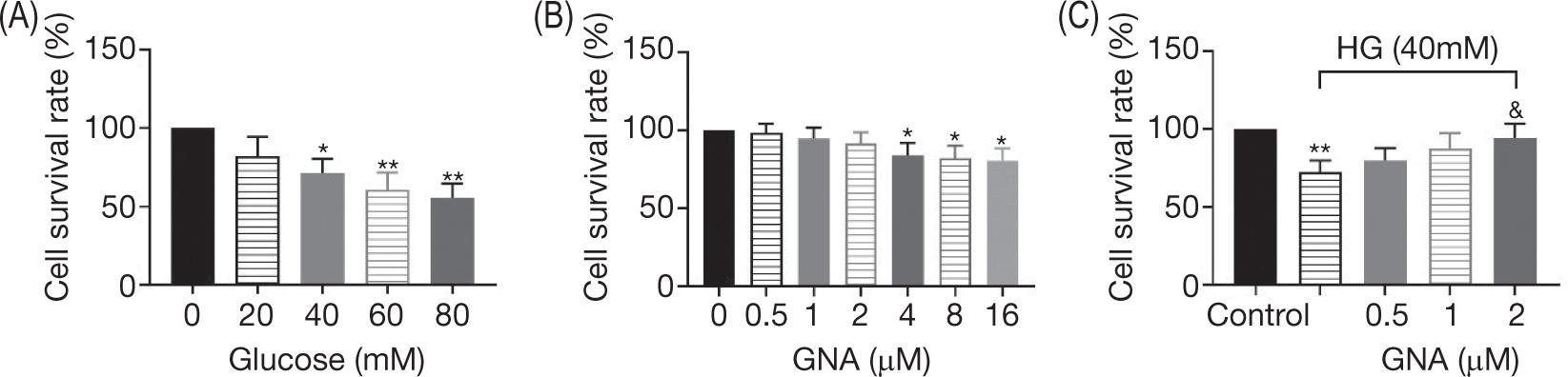Figure 1. Gambogenic acid enhanced the viability of high glucose (HG)-treated HK-2 cells. (A) D-glucose reduced the viability of HK-2 cells in a dose-dependent manner. (B) Gambogenic acid at concentrations of 0, 0.5, 1 and 2 μM had no significant effect on the viability of HK-2 cells, while at concentrations of more than 4 μM (8 and 16 μM) decreased the viability of HK-2 cells. (C) Gambogenic acid enhanced the viability of high glucose-treated HK-2 cells in a dose-dependent manner. *, **vs. control, P < 0.05, P < 0.01. &vs. HG group, P < 0.05.