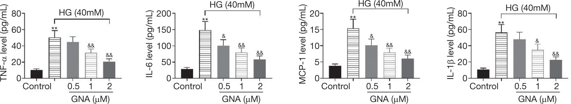 Figure 2. Gambogenic acid suppressed inflammation in high glucose (HG)-treated HK-2 cells. Gambogenic acid down-regulated the levels of TNF-α, IL-6, MCP-1, and IL-1β in high glucose-treated HK-2 cells. **vs. control, P < 0.01. &P < 0.05. &&vs. HG group, P < 0.01.