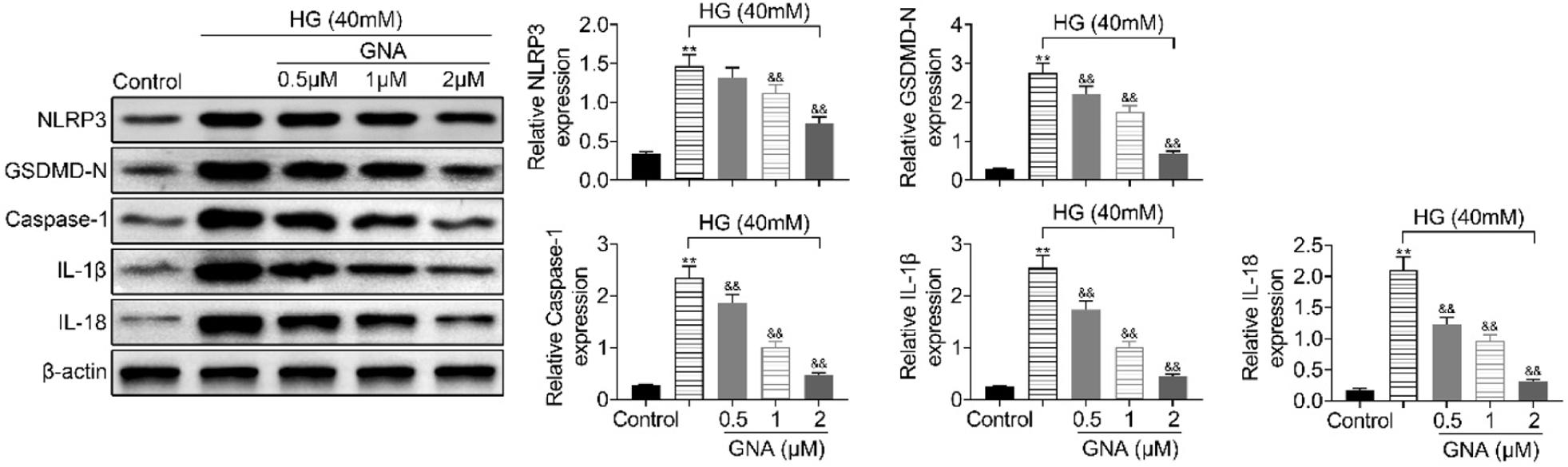 Figure 3. Gambogenic acid suppressed pyroptosis in high glucose (HG)-treated HK-2 cells. Gambogenic acid down-regulated the levels of NLRP3, GSDMD-N, caspase-1, IL-1β and IL-18 in high glucose-treated HK-2 cells. **vs. control, P < 0.01. &&vs. HG group, P < 0.01.
